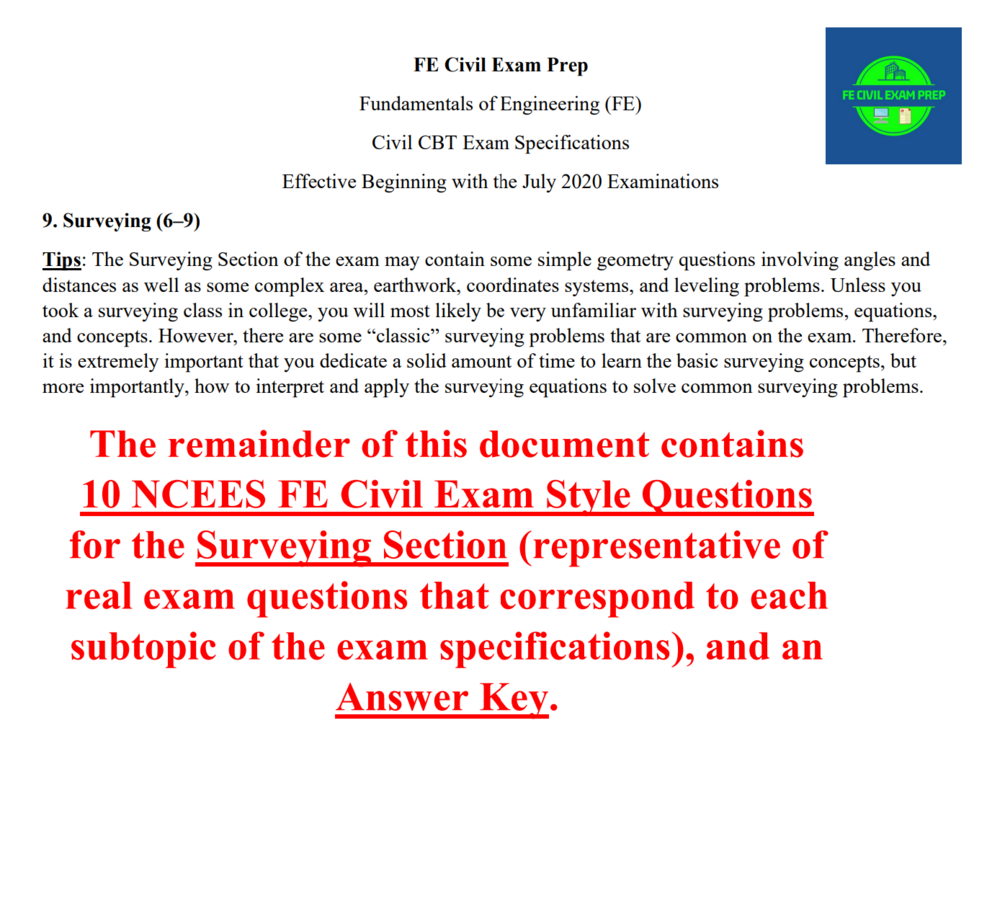10 NCEES FE Civil Exam Style Questions for the Surveying Section (representative of real exam questions that correspond to each subtopic of the exam specifications), and an Answer Key.