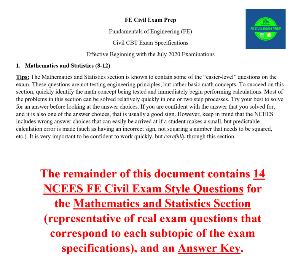 14 NCEES FE Civil Exam Style Questions for the Mathematics and Statistics Section (representative of real exam questions that correspond to each subtopic of the exam specifications), and an Answer Key.