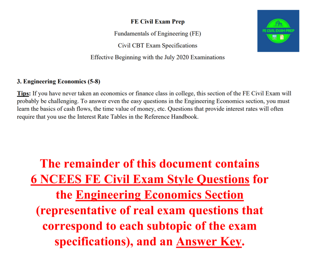 6 NCEES FE Civil Exam Style Questions for the Engineering Economics Section (representative of real exam questions that correspond to each subtopic of the exam specifications), and an Answer Key.
