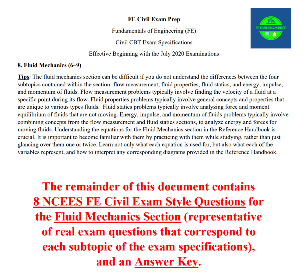 8 NCEES FE Civil Exam Style Questions for the Fluid Mechanics Section (representative of real exam questions that correspond to each subtopic of the exam specifications), and an Answer Key.
