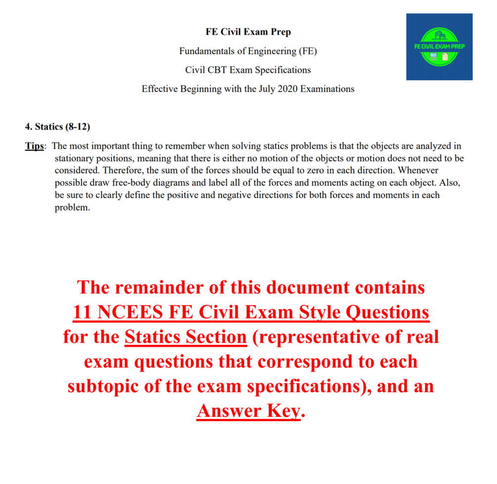 11 NCEES FE Civil Exam Style Questions for the Statics Section (representative of real exam questions that correspond to each subtopic of the exam specifications), and an Answer Key.